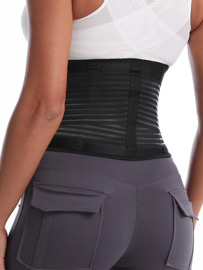 Uma cinta que se molda completamente ao redor da região lombar, projetada para fornecer compressão na região lombar.